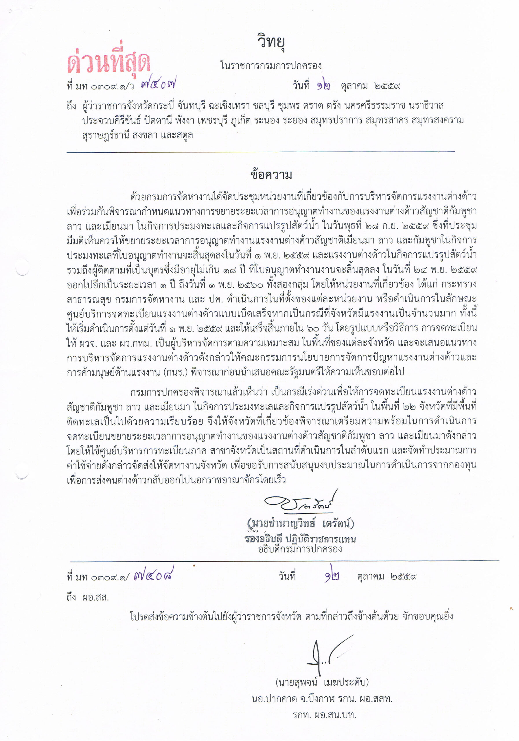 มท 0309.1/7407 เรื่อง เตรียมความพร้อมในการดำเนินการจดทะเบียนขยายระยะเวลาในการ อนุญาตทำงานของแรงงานต่างด้าวสัญชาติกัมพูชา ลาว และเมียนมา